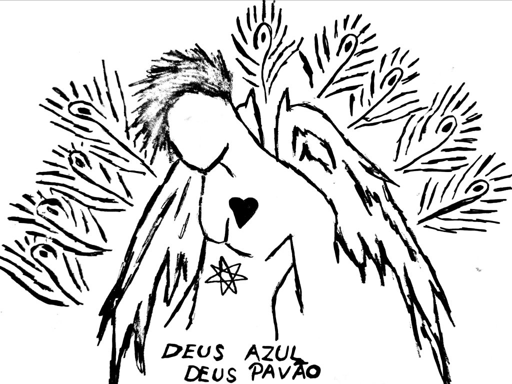 Penas de pavão adornam Seu cabelo, conectando-o a Melek Ta’us, o Anjo Pavão dos Yezidis que, apesar de estranhos interpretá-lo erroneamente como “o diabo”, o consideram o verdadeiro Deus deste mundo.” – “Os Deuses do Infinito“, Storm Faerywolf