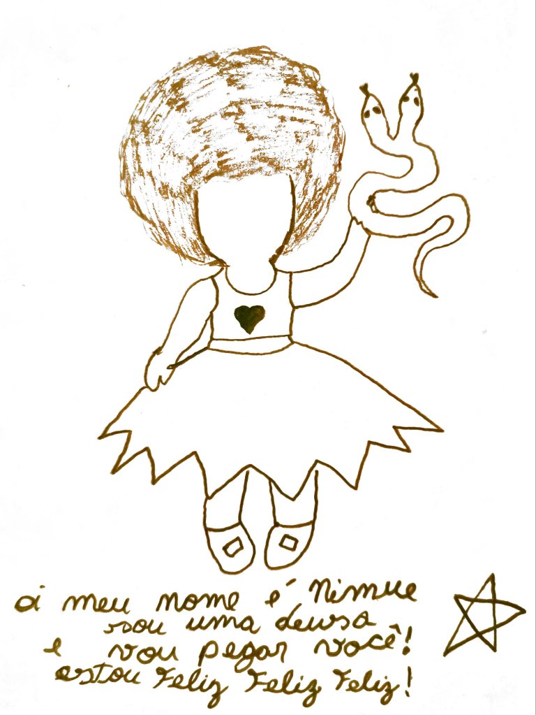 “O poder da criação e destruição, do ciclo das coisas, da juventude… imagine tudo isso nas mãos de uma criança. Essa é Nimue. Ela refaz, destrói e cria galáxias brincando de amarelinha, faz os anéis de Saturno de bambolê, pinta seu rosto com as poeiras cósmicas, faz das estrelas ingredientes para brincar de comidinha. Nimue é a criança estelar. Ela é o poder da criatividade. Brinque e assim você a entenderá.” – Naê
